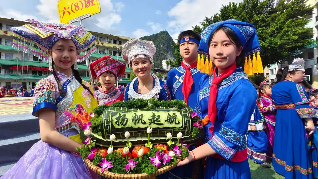 小学师生身着民族服饰开展“广西三月三”系列活动。